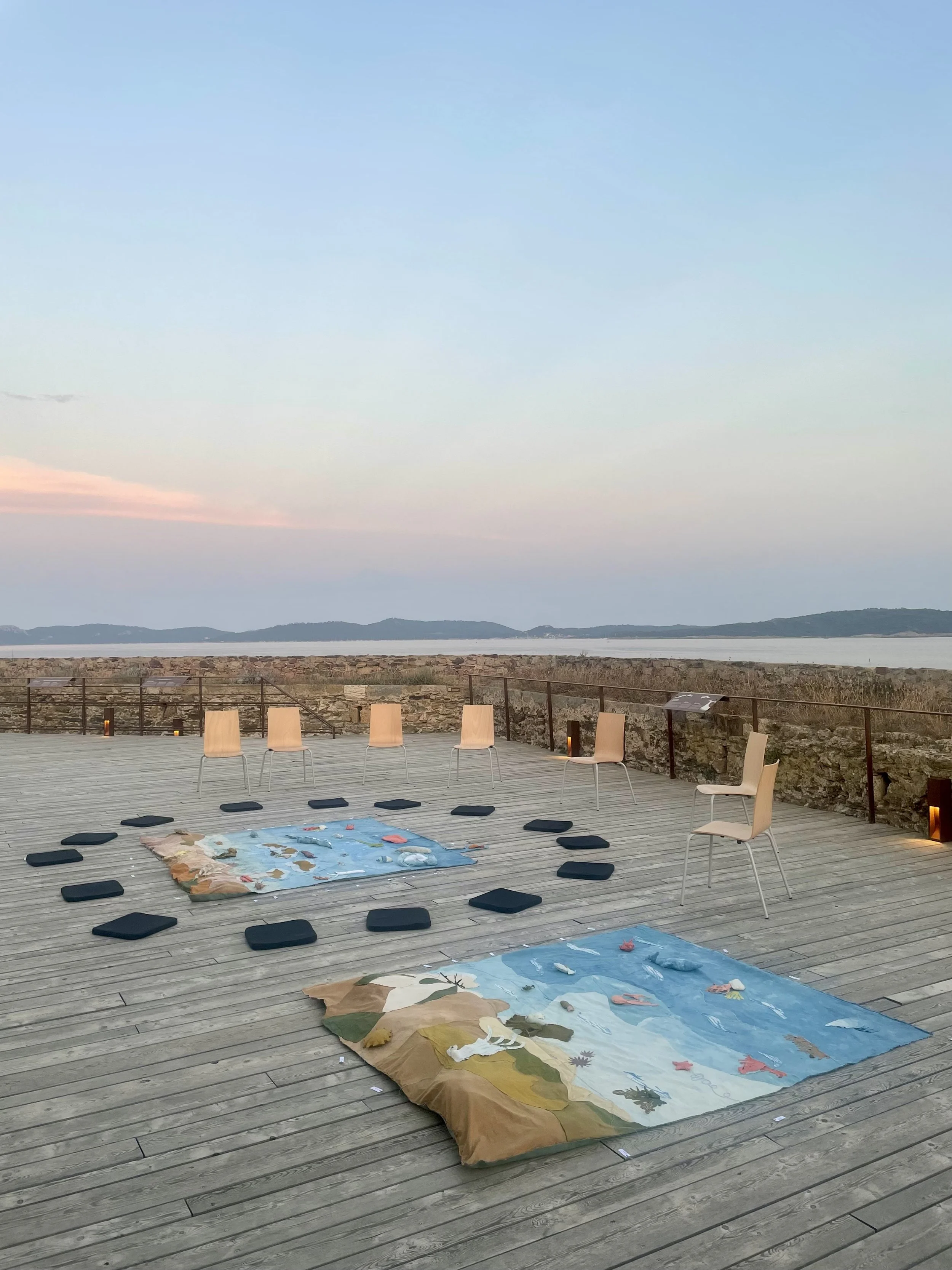 Ce projet mêle création textile et écriture de récits pour mettre en lumière les enjeux actuels de la Méditerranée. Nous avons ainsi écrit des fictions qui racontent des phénomènes comme les courants, les canicules sous-marines ou la migration des espèces, à travers le regard de plantes, d’algues, de cétacés… Et nous avons co-créé un tapis qui puisse illustrer et animer ces histoires lues lors de lectures contées.